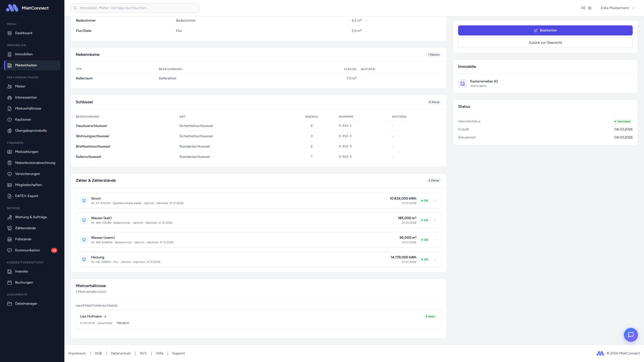 Auf der Detailseite einer Mieteinheit werden alle Schlüssel in einer übersichtlichen Liste angezeigt: