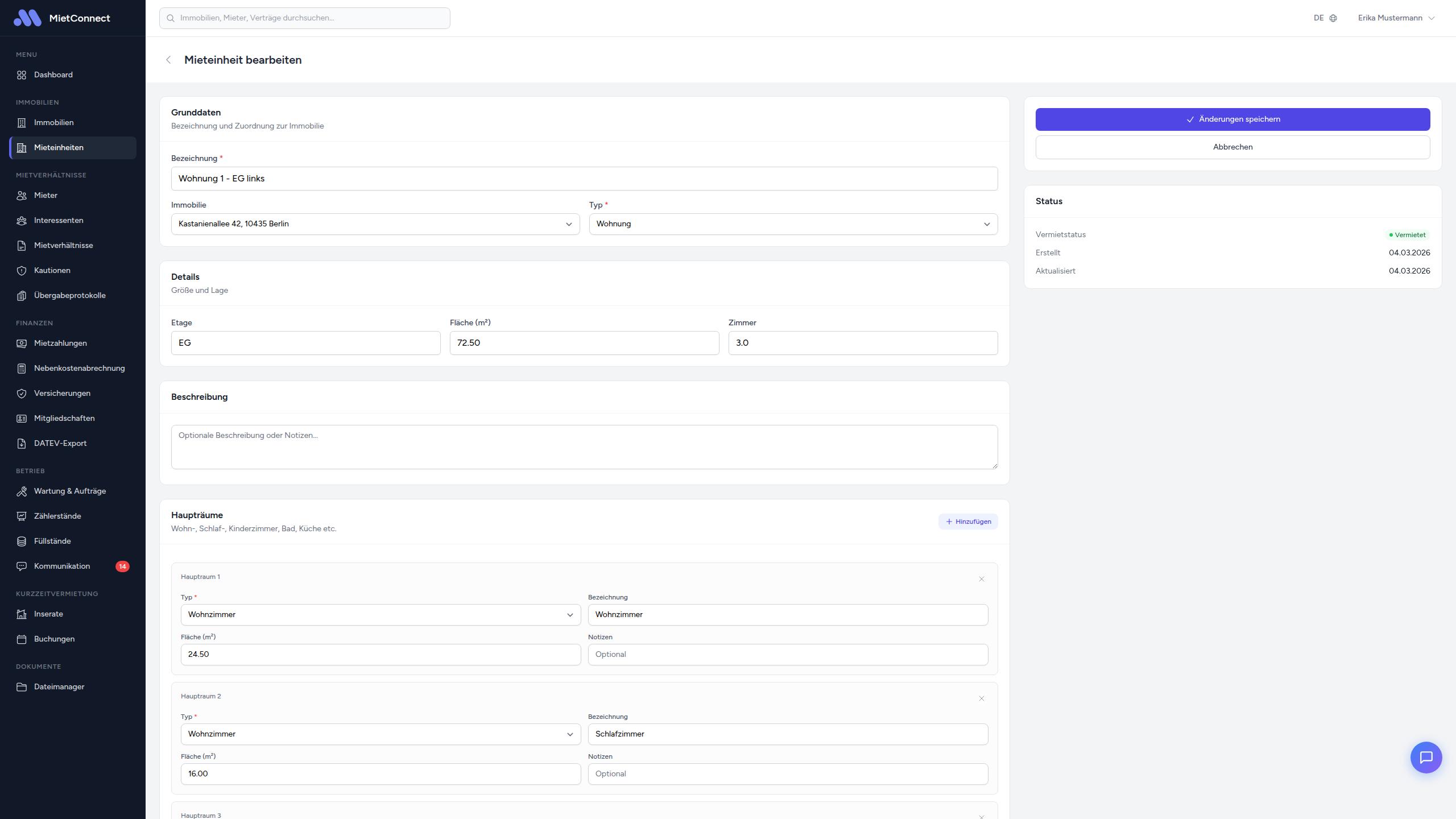 - Öffnen Sie die Mieteinheit und klicken Sie auf „Bearbeiten"