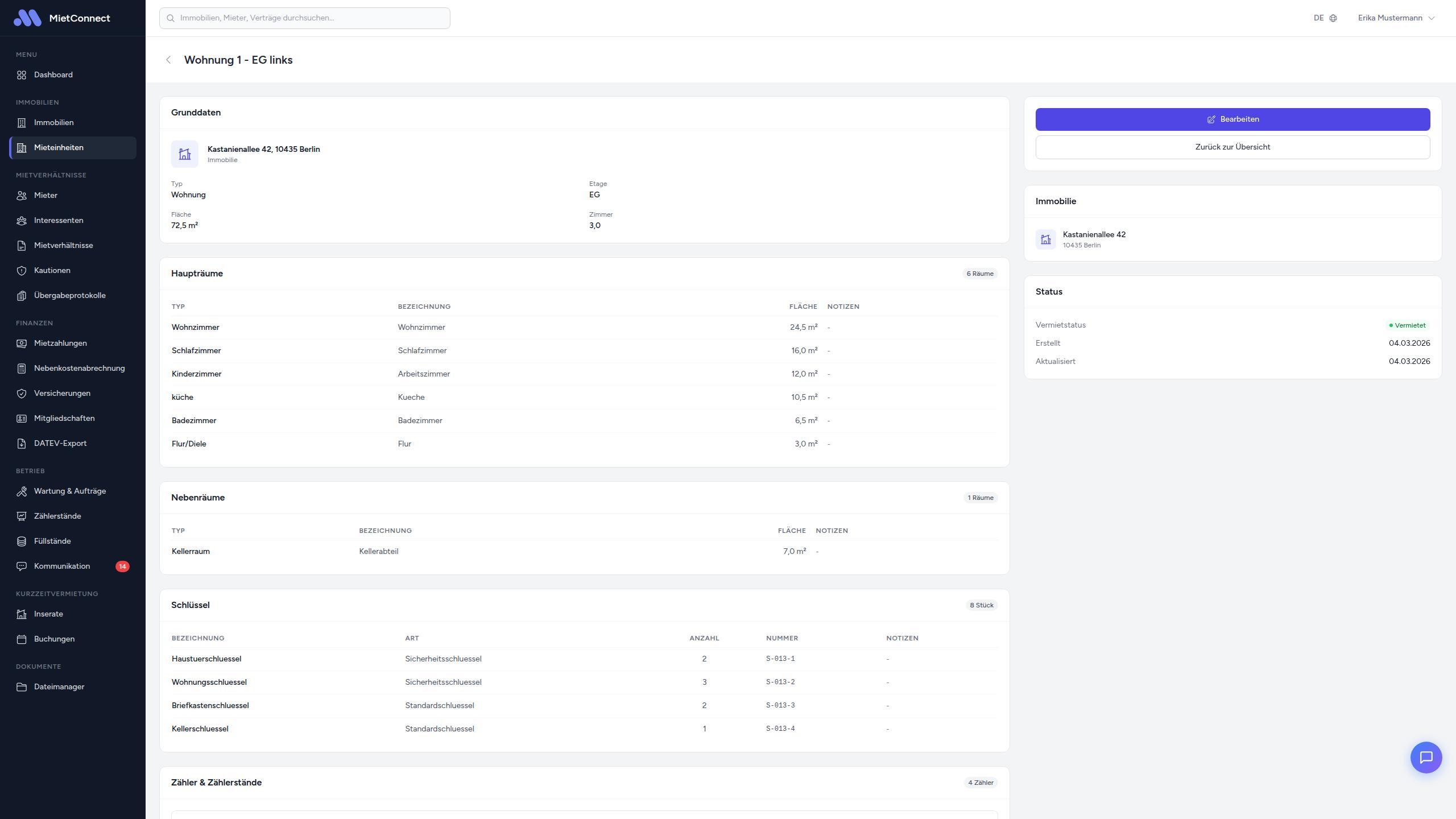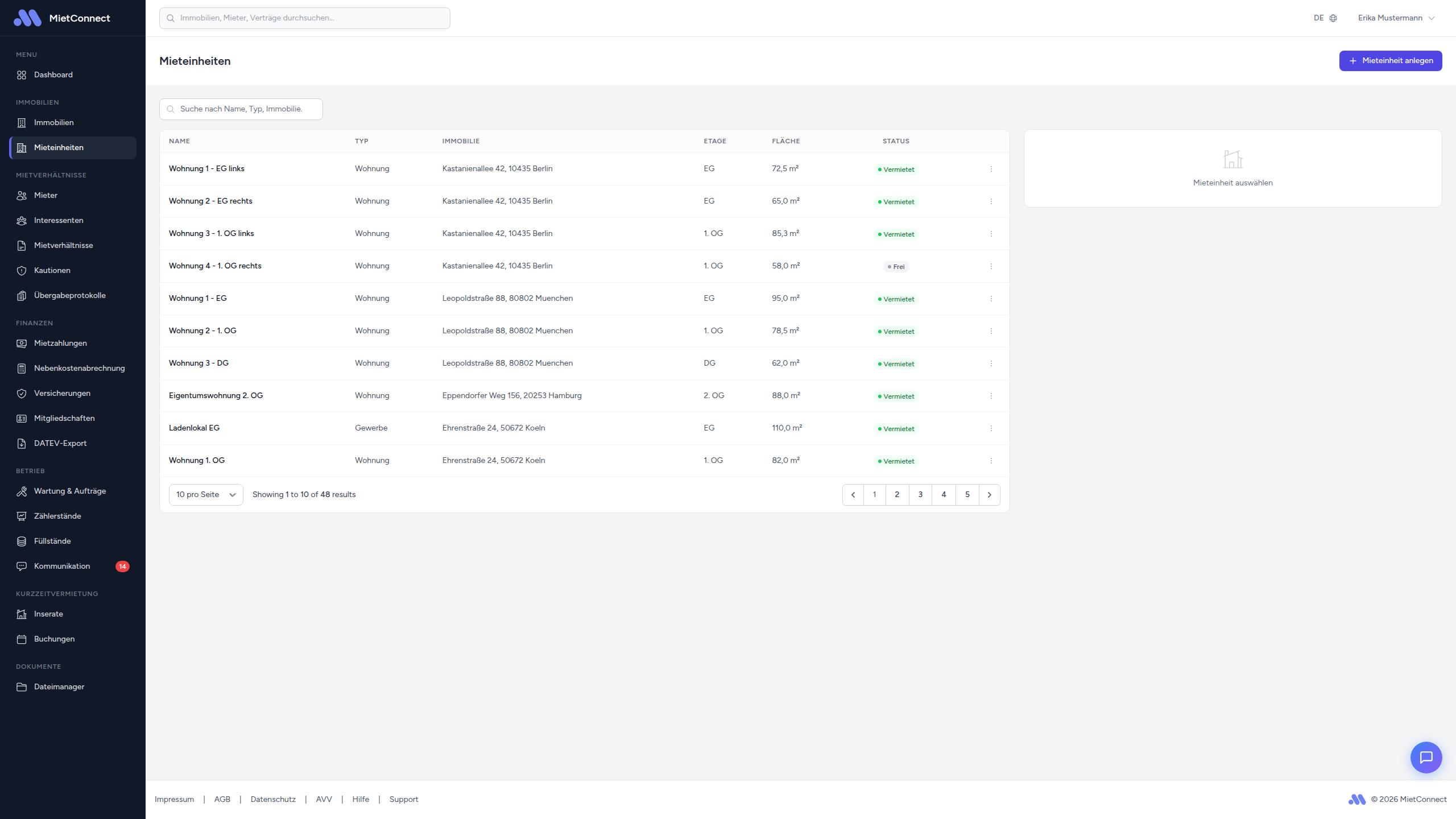 Die Übersicht zeigt alle Ihre Mieteinheiten in einer Tabelle. Folgende Informationen werden angezeigt: