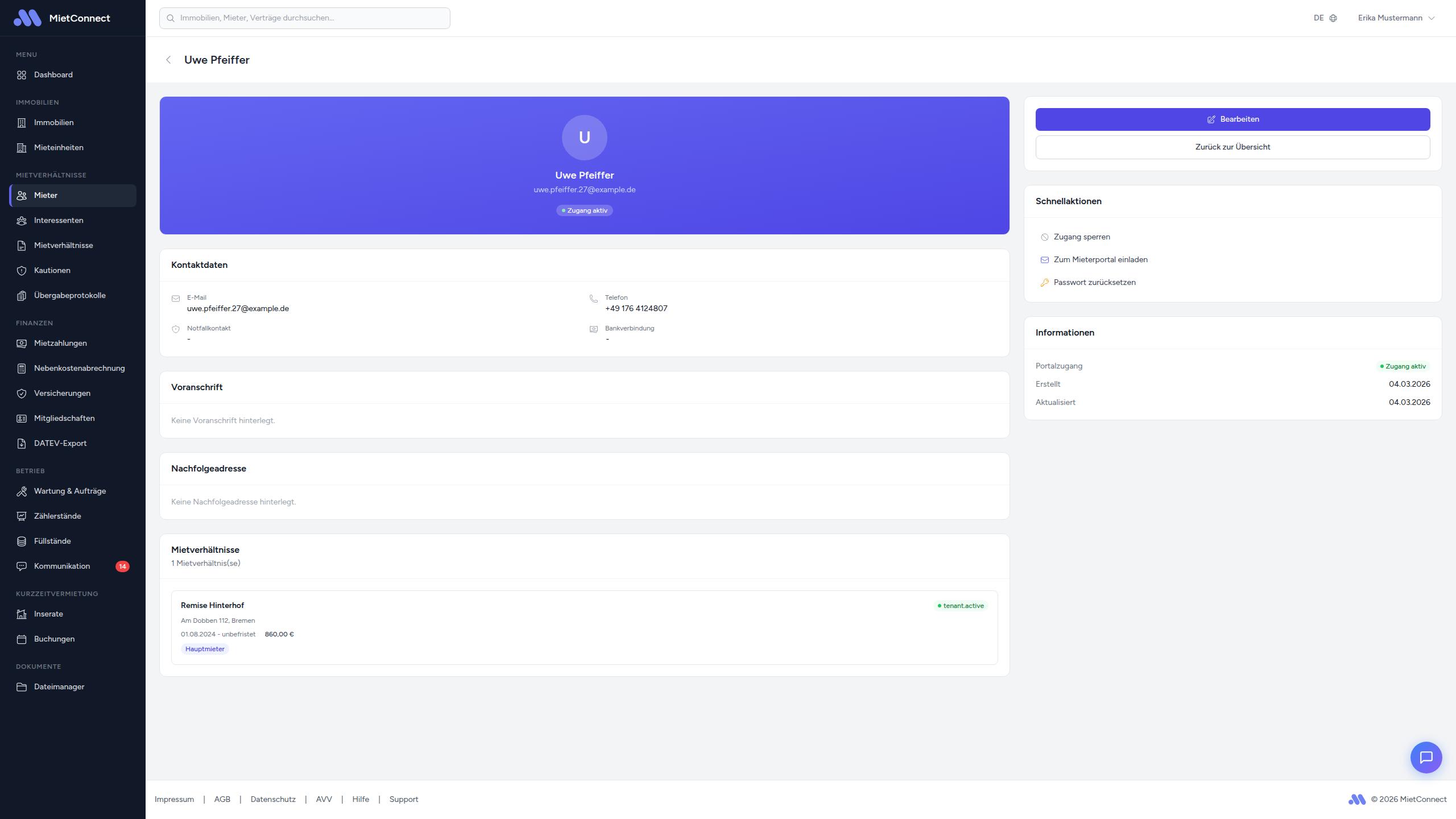 Klicken Sie auf einen Mieter, um die Detailansicht zu öffnen. Dort sehen Sie: